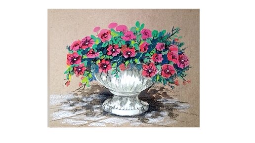 Садовая белая ваза с цветами. Рисунок гуашью на крафтовой бумаге.