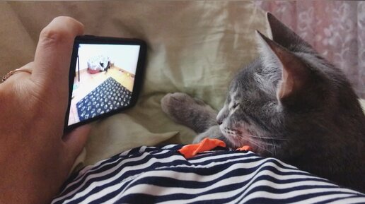 Кошка смотрит видео про щеночков, переживает и волнуется. Даже телефон мой сама включает