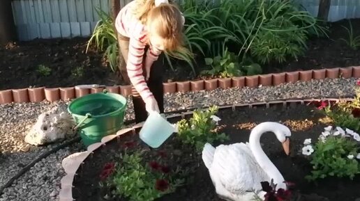 Внучка поливает петунию Тайдалы