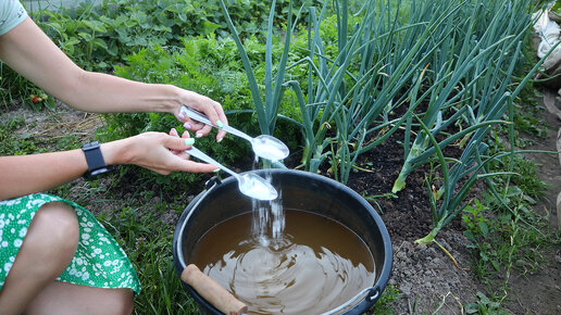 Смешиваю 2 удобрения для лука и чеснока в июле. Головки растут очень крупными. Последняя подкормка для лука и чеснока.
