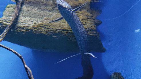 Рыба с ногами – это гигантский протоптер. Парные плавники превращены в жгутики. Рыба дышит атмосферным воздухом. В засуху спит в норе.