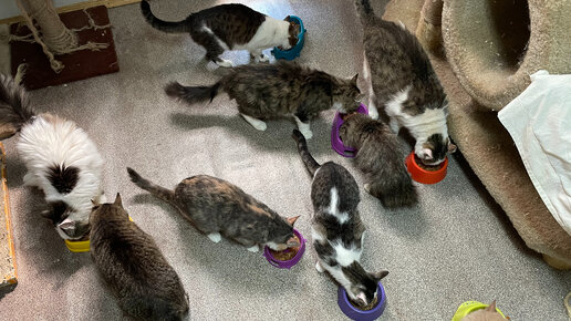 Обед у кошек в Кожуховском приюте, а мы рассуждаем о том, нужно ли мыть кошек