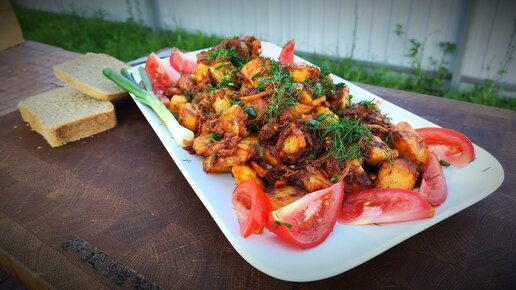 Жареная картошка с тушенкой в казане. Походная кухня.