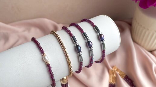 Колье, браслеты и серьги с жемчугом и синтетическим гранатом