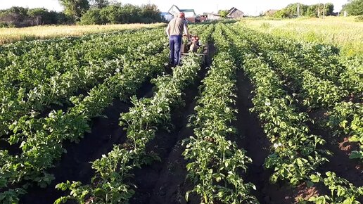 Третье окучивание картофеля мотоблоком 2022г. По высокой ботве дисковым окучником