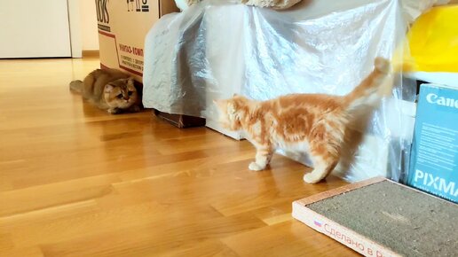 Новый домик. Экзотик Рози исследует прихожую, Криспи наблюдает.