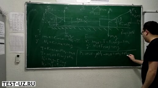 Определите ускорение (м/с), с которым будет двигаться система двух тел, указанных на рисунке, если: m1=10 кг, m2=20 кг, F1=500 Н, F2=500 Н