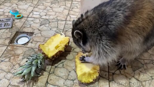 Реакция енотов Зефирки и Горушки на ананас