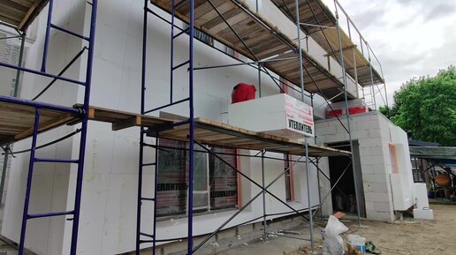 Приклейка пенопласта на оконные откосы, приклейка пенопласта ППС16ф 250мм на фасады газобетонного дома. СФТК Мокрый Фасад.