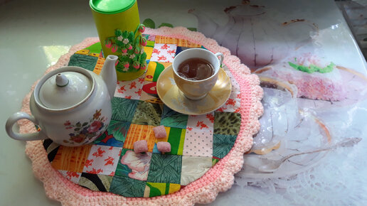 Салфетка или коврик для посуды из остатков ниток и лоскутов ткани