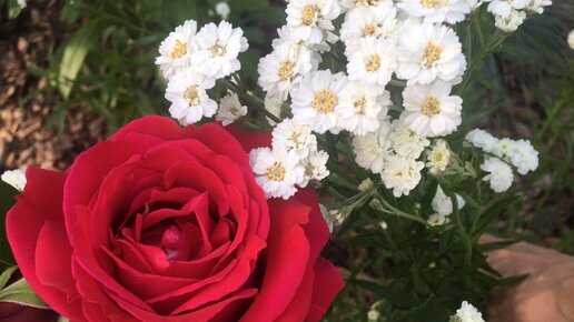 Идеальное сочетание красных роз и птармики Жемчуг,туя Холуб и другие жители сада.