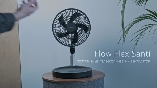 Мощный беспроводной вентилятор Flow Flex Santi. Легко взять с собой и удобно складывать.