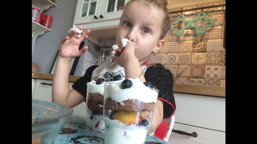 Трайфл (десерт в стаканчике) с голубикой и клубникой. Дети готовят еду сами.