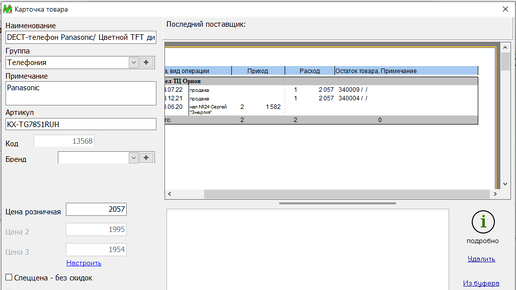 Быстрое редактирование цены и характеристик товара. И просмотр всех операций с товаром и его остатка в другом магазине/складе
