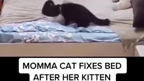 Кошка-мать прогнала расшалившегося котенка, а потом заправила смятое им покрывало
