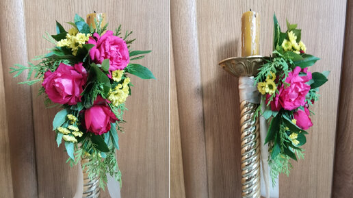Украшение дьяконской свечи. Букет в форме капли из тейпированных цветов.