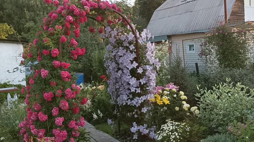 Цветущая арка с рамблером Excelsa и клематисом Blekitny Aniol