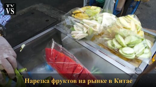 Уличный волшебник по нарезке фруктов на рынке в Китае.
