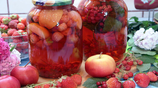 Клубничный компот с красной смородиной, яблоками и листьями чёрной смородины