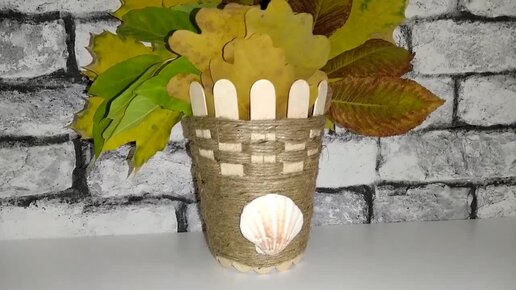 Ваза из пластикового стакана, деревянных палочек, джута.