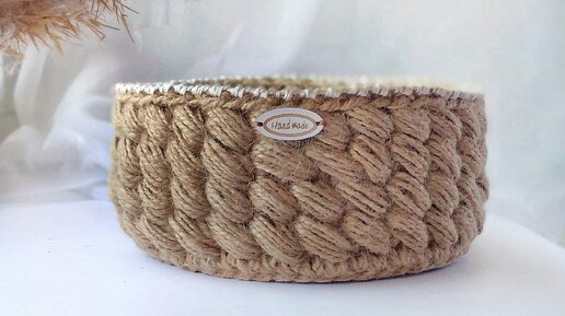 Корзина из джута крючком. Узор № 3. Пышные столбики. Вязаная корзина.