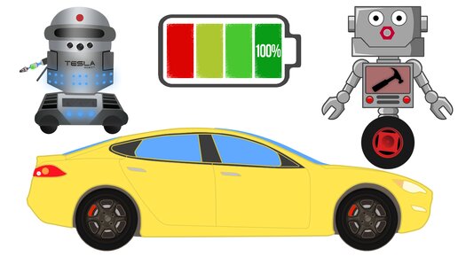 Автомеханик Роби и его новый помощник Робот Тесла ремонтируют электромобиль.