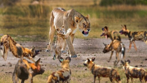 Львица Против Диких Собак, Спасает Львенка Рискуя Жизнью