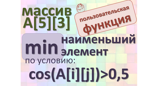 #11 Блок-схема С++ Mathcad Двумерный массив A[5][3], найти min наименьший элемент по условию cos(A[i][j])>0.5 Составить пользовател функцию