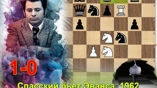 Амбициозный Спасский как белый лев накинулся на позицию короткой рокировки Ларри Эванса (Варна, 1962), а в итоге поставил красивый мат, 1-0