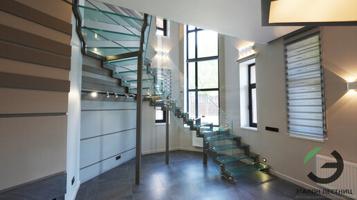 Лестница в дом из стекла и металла. Более 1 тонны стекла.