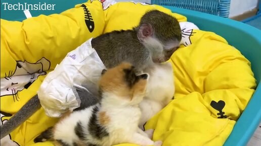 НЯНЮ ВЫЗЫВАЛИ? Малышка обезьянка помогает маме-кошке уследить за маленькими непоседами