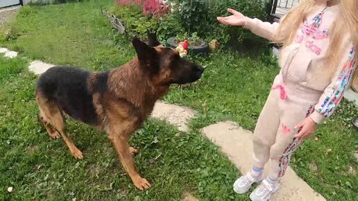 Девочка играет с немецкими овчарками