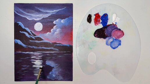 Простой способ нарисовать лунную ночь на реке🌙🌊 Пошаговое видео // Картина акриловыми красками🖼️🎨 Акриловая живопись