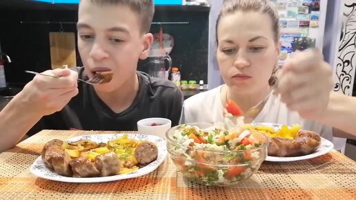 МУКБАНГ ЖАРЕНАЯ КАРТОШКА_КОЛБАСКИ_САЛАТ