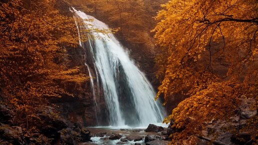 Осенний лесной водопад. Красивый природный пейзаж и водопад