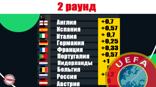 Таблица коэффициентов УЕФА после 2 раунда ЛЧ и ЛК + ТОП-6 стран по очкам.