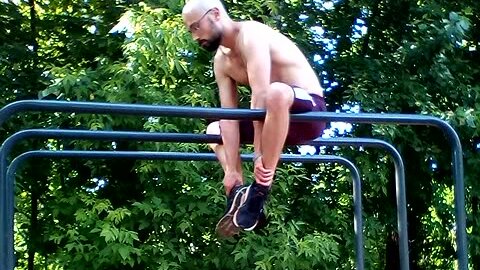 Растяжка бедер на брусьях