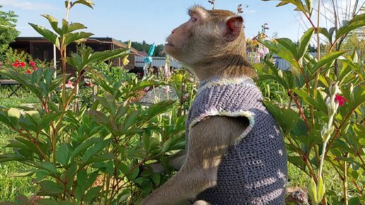 Макака Семён помогает убирать траву в огороде (Домашние макаки)