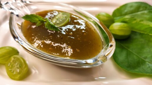 Варенье из зелёного крыжовника с мятой и вишнёвым листом.