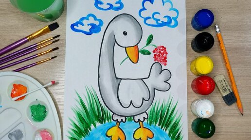 Рисуем забавного гуся. Легкий рисунок гуашью. Урок рисования для детей