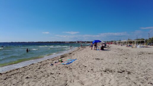 Пляж в курортном посёлке западного Крыма, Межводном. Песок кремового цвета и чистое, тёплое море. Конец июля 2022г.
