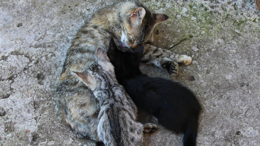 Кошка Рыся кормит котят молоком, а сама - моется