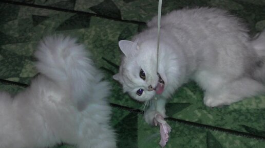 Кошка Джулька ловит игрушку на резинке и пытается перегрызть резинку