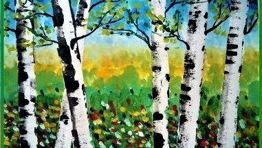 Интересно и просто рисуем пейзаж, березы, малярным скотчем и пластиковой карточкой.