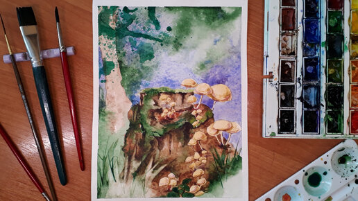 Рисуем акварелью, пенёк с грибами готово, сказочный пейзаж.