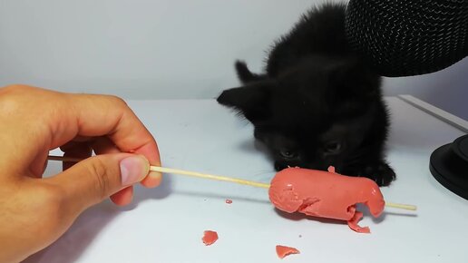 Котёнок есть сосиску! Вы только послушайте этот звук...