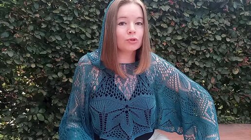 Летняя ажурная накидка болеро пончо с капюшоном спицами.