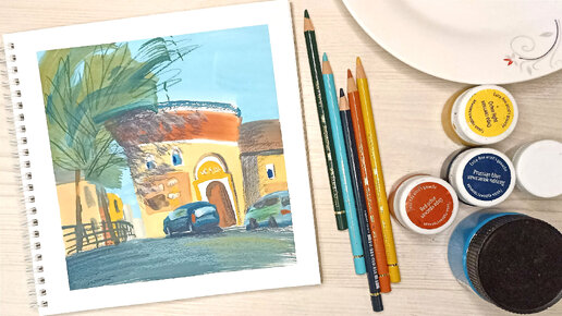 Скетчинг гуашью: улочка в городе