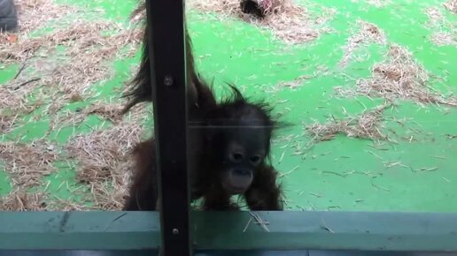 Малыш орангутан пытается открыть окно и выйти к людям!