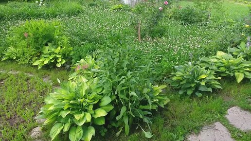 Газон из белого клевера. Клевер прекрасно смотрится в сочетании с хостой; кроме этого обогащает почву азотом и является отличным медоносом